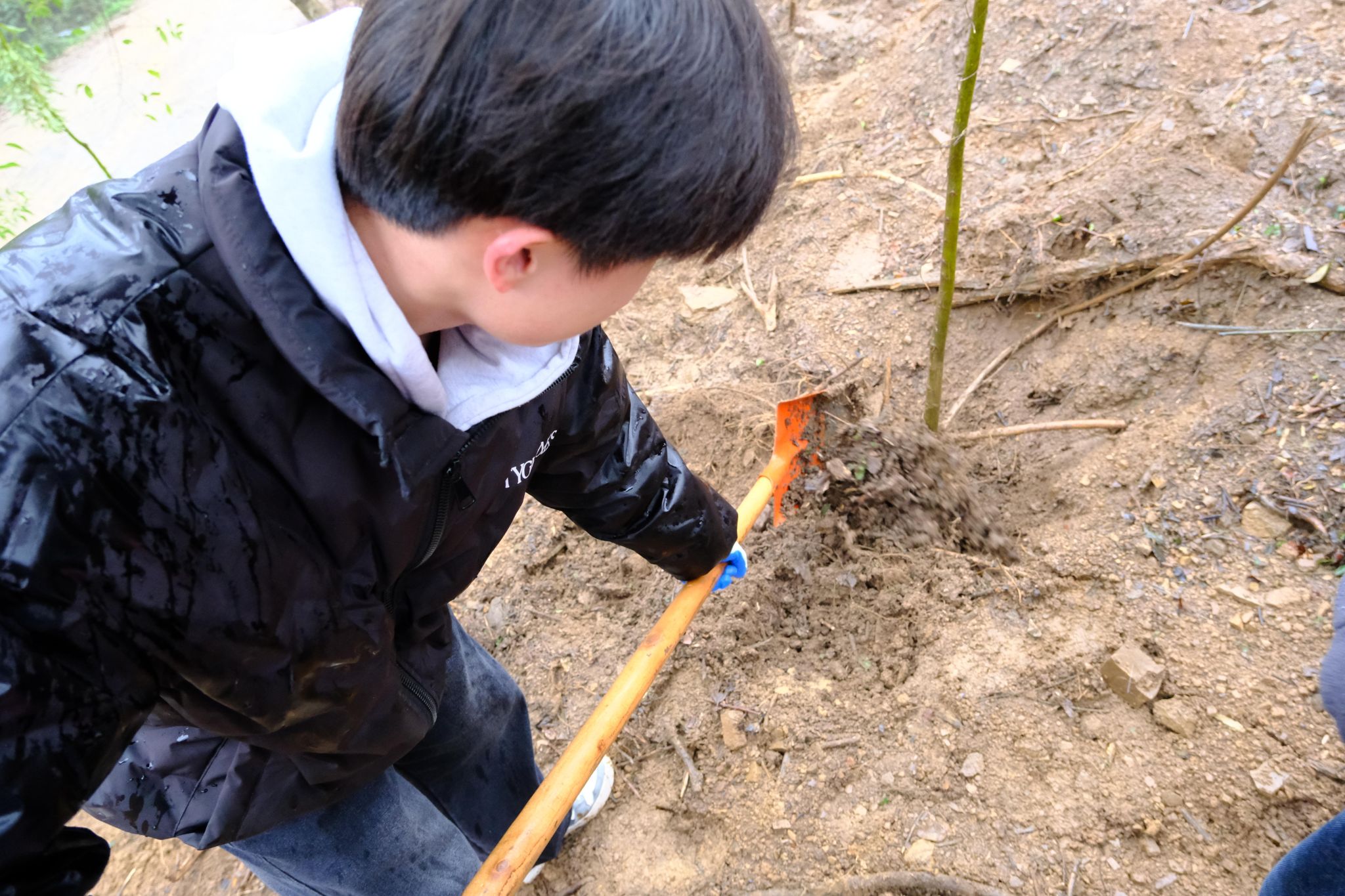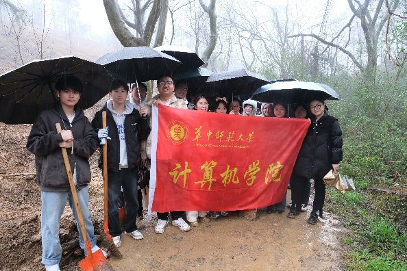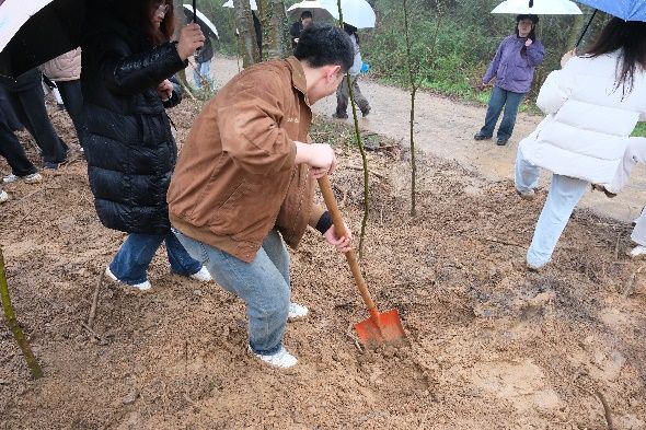 到达目的地后,大家迅速领取植树工具,分组有序地投入到植树活动中。尽管地面泥泞湿滑,细雨打湿了衣衫,但同学们依旧干劲十足。按照前期活动安排,同学们跨学院组成三人小组开展植树工作,分工明确,配合默契。有的挥锹铲土,有的扶苗填坑,有的为同学撑伞,每一个环节都认真细致,确保树苗能够茁壮成长。