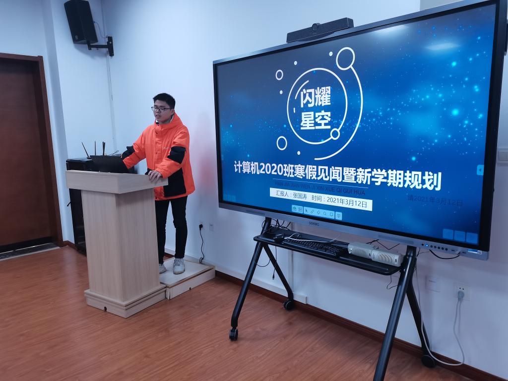 接下来迎来了精彩的“寒假见闻暨新学期规划”分享活动。假期虽然冗长,但同学们仍然过得很充实,纷纷向大家分享属于自己独一无二的寒假经历——蒋序朝分享了自己在寒假后的真实感悟,令在场人员感慨不已;团支书龚娜回忆了自己在假期投身于代码程序应用的忙碌经历;余卓立收集了寒假所浏览的新闻截图;张淼以PPT动画的方式回顾了寒假的点点滴滴;田倩婷、王真真与王祥琴重点分享了新学期的规划;王茜表达了自己对于未来的展望;周雨晓分享了寒假参与志愿活动的宝贵经历;陈毅和刘晗带领大家了解各自家乡的山水风光,陈为婷也表达了自己对于新学期的期望......同学们自然而率真的表现,赢得了全场的赞许。