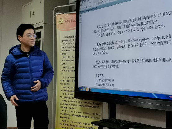 随后,指导老师胡珀给俱乐部成员们介绍了iOS俱乐部的目标、背景、宗旨以及团队以后的主攻方向。他指出,要建立一支以面向移动应用创新与创业为目标的跨学科协作式学习实践团队,打造有新意、有趣、易用且优雅的各类精品移动应用程序。同时,他强调“设计-产品-代码”三者一个都不能少,要进一步加强与其他学院和周边高校的交流。指导老师莫然介绍了科研立项情况,鼓励学生们勇于创新尝试,提高写作水平,做好长期准备。