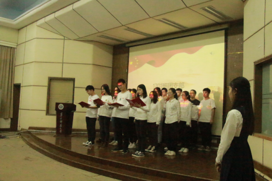 首先登场展示的是1701班团支部带来的合唱《我和我的祖国》,“我和我亲爱的祖国,一刻也不能分割,无论我走到哪里…….”歌声在报告厅里飘扬,歌声里传递出他们对祖国的热爱,青春与祖国同在的深情。手里挥着小红旗的他们,心里也时刻装着祖国!紧接着上台表演的是1801团支部,他们为我们带来合唱歌曲《倔强》,“我和我最后的倔强,我在风中大声地唱”,他们唱出了热血,唱出了青春!