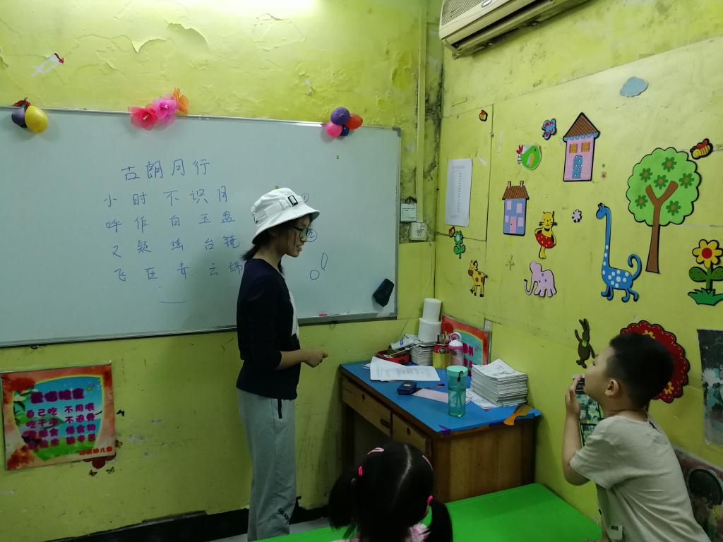 活动中,负责大班的志愿者开展了古诗《古朗月行》的教学。首先,小朋友们在志愿者的带领下大声朗诵着古诗,初步体会到了古诗的音韵之美。接着,志愿者介绍了古诗的创作背景,并用浅显生动的语言解释了古诗的内涵和主旨。在志愿者绘声绘色的讲解中,小朋友们感受到了诗歌的魅力。