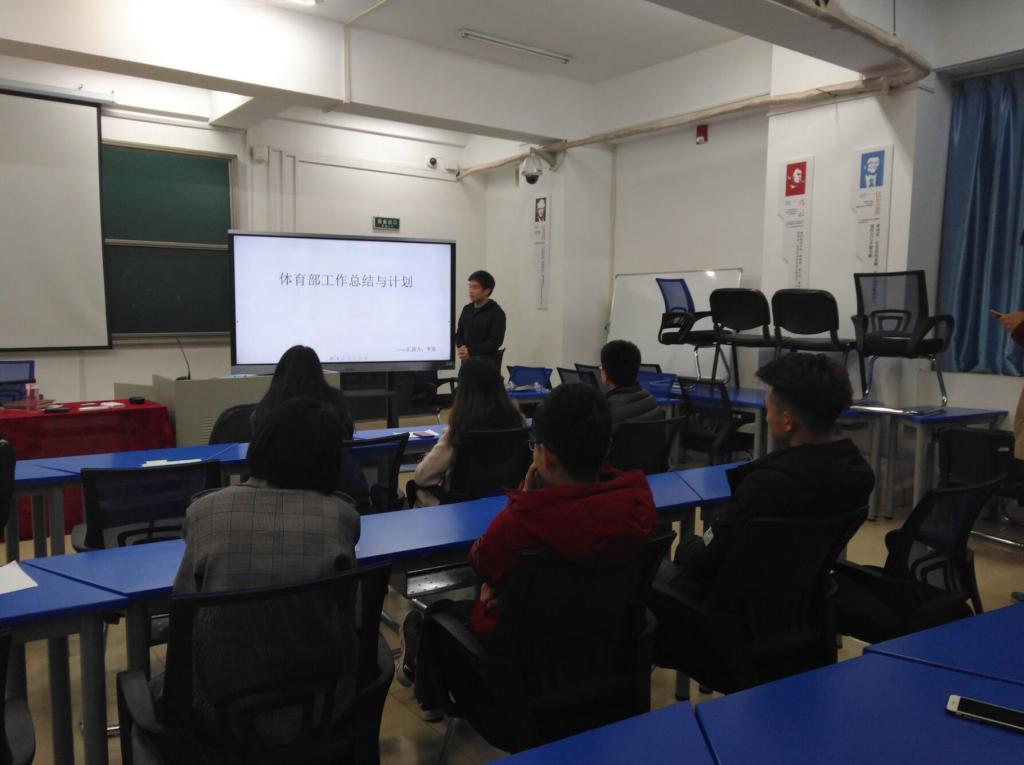 接下来各职能部门依次发言;学术部同学向大家征集有关主办百年求索学术讲座的意见,体育部介绍了这学期将要举办的跨校联谊趣味运动会、篮球赛、羽毛球赛和夜跑活动,组织部同学介绍了正在进行的党员群众一带多活动等等。大家都表示在接下来的工作中要继续与主席团及各部门进行深入的合作沟通,建立奖评机制提高同学们的活动参与度。副主席李佳恒做了总结性发言,一是代表主席团表达了今后会对各部门工作进一步的支持帮助,二是加强和本科生的联系,三是希望大家继续尽职尽责,继续在学生活动实践中提高自身业务水平。