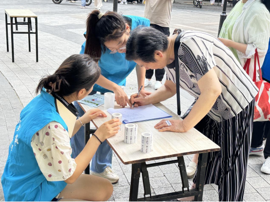 (图为志愿者为居民登记)