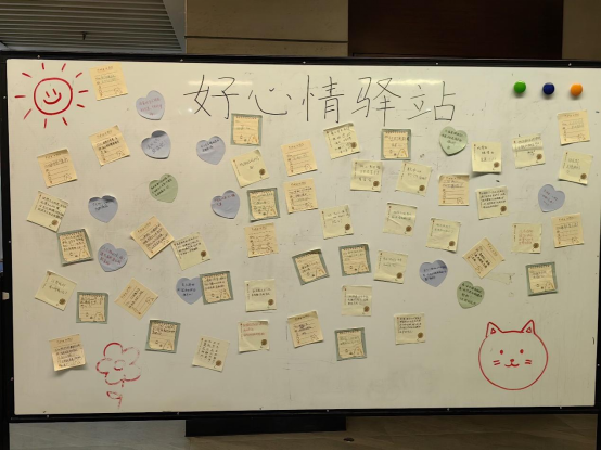 在工作人员的介绍下,学生们在便利贴上写下生活中的趣事、此刻的心情、美好的祝愿、缓解焦虑的方法等,并将其贴在“好心情驿站”展板上,成为同学们之间情感交流的媒介。完成分享的同学都获得了一份精美的礼品,鼓励他们继续善于倾听自我、敢于表达自我。“好心情驿站”营造了积极温暖的氛围,让大家发现生活中的乐趣、缓解学习中的焦虑,帮助彼此更好地适应新的学期。