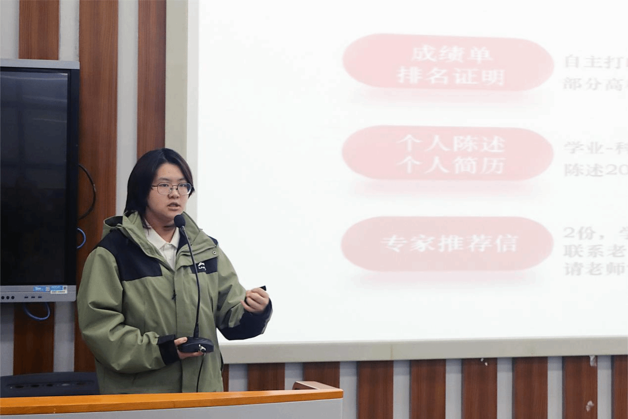 罗冰垚结合自身经历系统讲解了保研的核心要求与前期准备要点。她鼓励同学们打好学业基础、主动参加学科竞赛,并密切关注目标院校的招生动态,以全方位的准备争取学术保研资格。她最后强调,保研过程中要有相信自己、坚持到底的恒心和毅力。