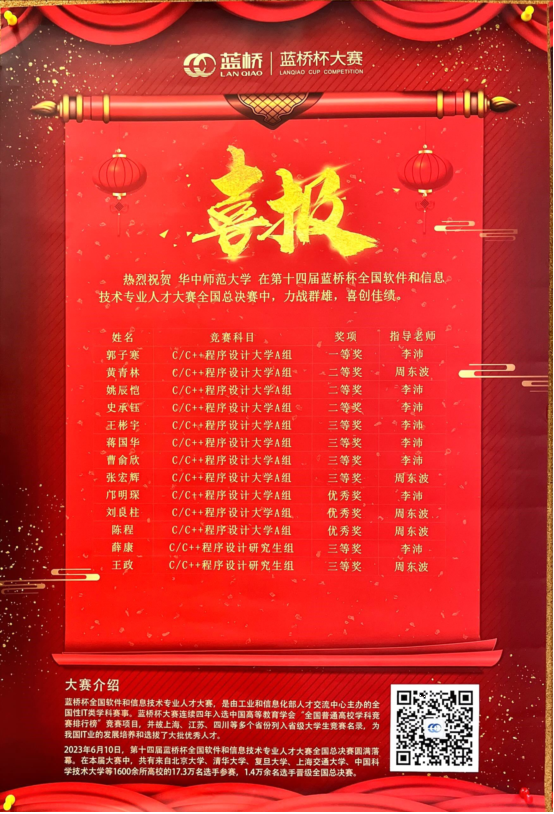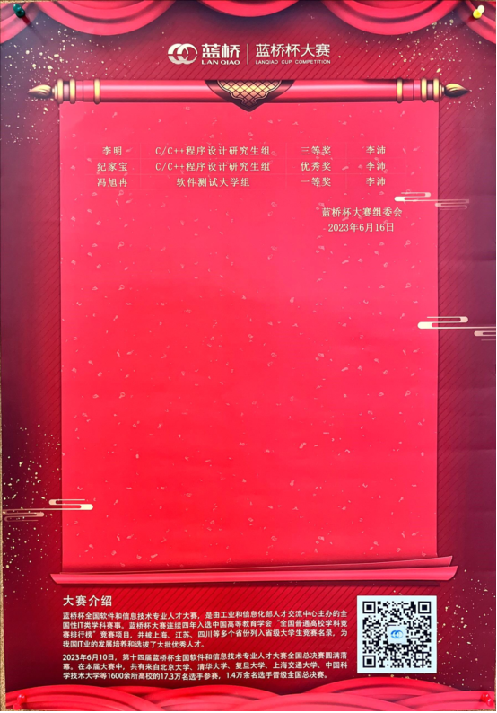 2023年6月10日,第十四届蓝桥杯全国软件和信息技术专业人才大赛全国总决赛圆满落幕。龙8-long8(头号玩家)国际唯一官方网站学子从17.3万选手中脱颖而出,共获得一等奖2项,二等奖2项,三等奖5项,优秀奖2项。其中,C/C++程序设计大学A组获得一等奖1项、二等奖2项、三等奖3项、优秀奖1项;C/C++程序设计研究生组获得三等奖2项、优秀奖1项;软件测试大学组获得一等奖1项。