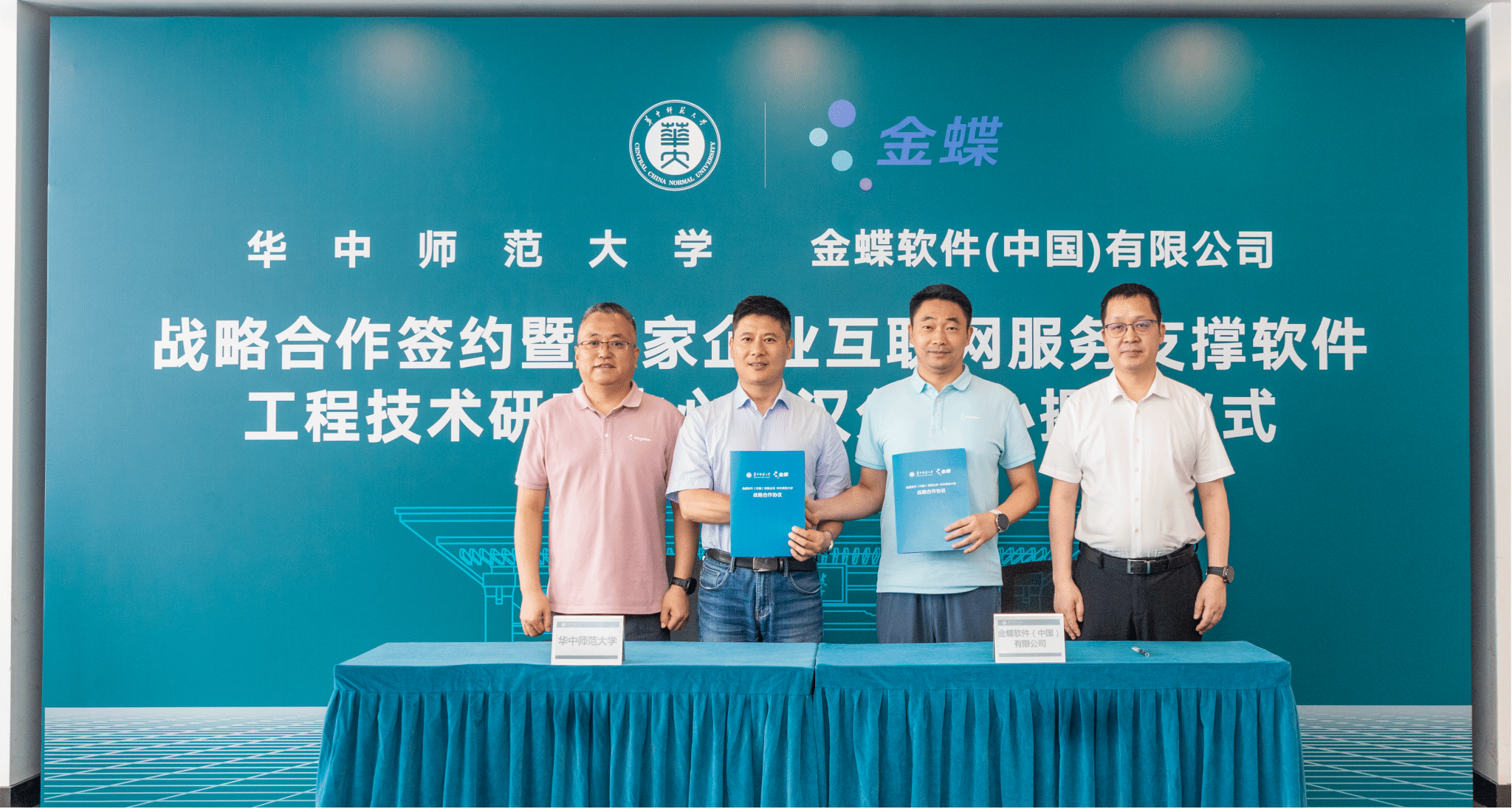 签约仪式上,王坤与陈慧蛟代表双方单位签署《金蝶软件(中国)有限公司与华中师范大学战略合作协议》。刘三女牙、林法成等双方领导共同见证签约。