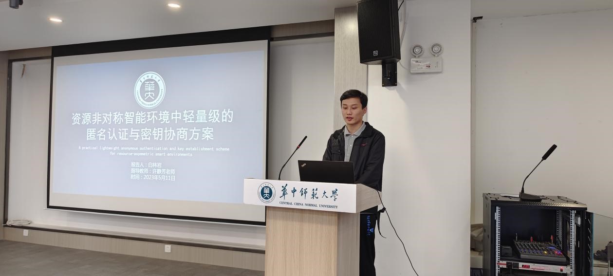 经过短暂的茶歇环节,论坛的第二部分开始,由陈嘉耕副教授主持。报告人2020级硕士研究生白林岩汇报的主题是“面向资源非对称智能环境的实用轻量级匿名认证与密钥建立方案”。该工作基于Rabin密码体制提出了新的方案,能够更好地利用丰富的网关资源优势、实现设备端和用户端的轻量级操作,同时可以提供用户匿名性。
