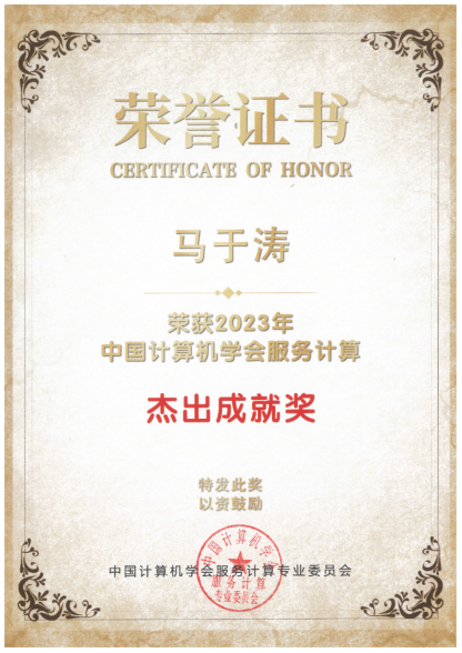 从日前结束的由中国计算机学会(CCF)主办的2023年中国数字服务大会获悉,我院马于涛教授获得CCF服务计算杰出成就奖(另一位获奖者为天津大学薛霄教授)。