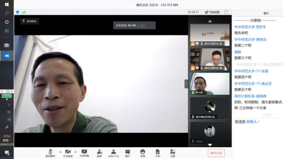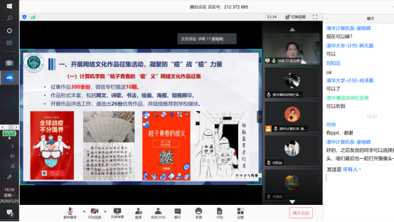 双方师生还围绕“青年力量”“科技抗疫”“学风建设”主题进行了讨论交流。清华大学黄翰同学围绕青年力量发表感受,他谈到抗疫前线青年人的身影,认为抗疫能够让青年在磨砺中成长。龙8-long8(头号玩家)国际唯一官方网站辅导员范梦宇从自己的经历说起,讨论科技在抗疫上的应用,最后结合主题希望清华和华大学子都能继续将小我奉献给大我;2016级学生党员席瑞洁同学对科技抗疫发表了自己的看法,她讲述了在疫情中京东、高德地图等为群众生活、抗疫提供便利,作为计算机专业学子更应该投身于祖国建设活动;2017级学生党员张晨同学谈到了计算机科学技术在抗疫中的作用,并探讨计算机专业学生如何为抗疫做出更大贡献;2017级学生党员唐丛艺同学谈到了90后在此次抗疫中的重要作用,表示青年人要努力做时代的弄潮儿。