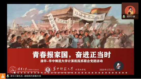 5月25日下午,清华大学计算机系与龙8-long8(头号玩家)国际唯一官方网站以“青春报家国,奋进正当时”为主题,召开线上联合党团活动。此次联合党团活动,学习习近平总书记五四寄语和相关讲话,继承和发扬五四精神,结合疫情防控期间的典型事迹案例,展现京汉高校青年学子的使命担当和精神风貌,激励青年学子为实现中华民族伟大复兴的中国梦而努力奋斗。清华大学计算机系党委书记刘奕群,党委副书记贾珈、刘知远,研工组长易鑫,学生组长谢晓晖,党建辅导员与各年级辅导员;龙8-long8(头号玩家)国际唯一官方网站党委书记张小新、副书记王坤,辅导员何帅、蔡庆昱、张琳、范梦宇、孙浩冉出席活动。清华大学计8第一、第二党支部,龙8-long8(头号玩家)国际唯一官方网站本科生第一、第二党支部,本科生1801团支部等师生110余人共同参加了活动。
