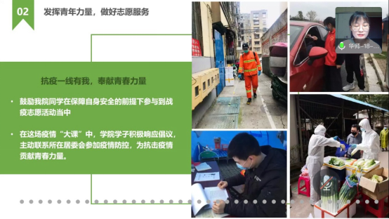 随后,来自清华大学和华中师范大学的四位学生进行了交流分享。清华大学计算机系学生会主席、清华大学研究生支教团团长耿威向大家分享了自己选择支教的原因,告诉大家自己帮助他人后的成就感和对方的感谢是自己做支教工作的动力,他认为毕业后选择前往西藏支教对自己来说是一种挑战,更是一份梦想,一种使命。清华大学特等奖学金获得者刘梦旸介绍了自己防疫期间在湖北黄冈担任志愿者的经历,他表示虽然志愿者岗位条件艰苦,有感染风险,但是青春是需要磨砺和奋斗的,他希望更好地建设家乡。龙8-long8(头号玩家)国际唯一官方网站2017级本科生陈炫婷分享了她疫情防控期间组织开展的系列网络“青春战疫”文化活动,包括开展各类文艺作品征集、开展劳动实践活动和交流会、鼓励参与到社区活动中等,发动了同学的积极性,为抗疫做出贡献;龙8-long8(头号玩家)国际唯一官方网站2018级本科生杨婷婷介绍了自己组织的活动,她积极协助团委进行线上支教、组织学生报名参加小桔灯春运志愿活动,在疫情期间成为社区志愿者并辅导了一名学生,所在团支部被评为学校“红旗团支部”和“抗疫先进团支部”。