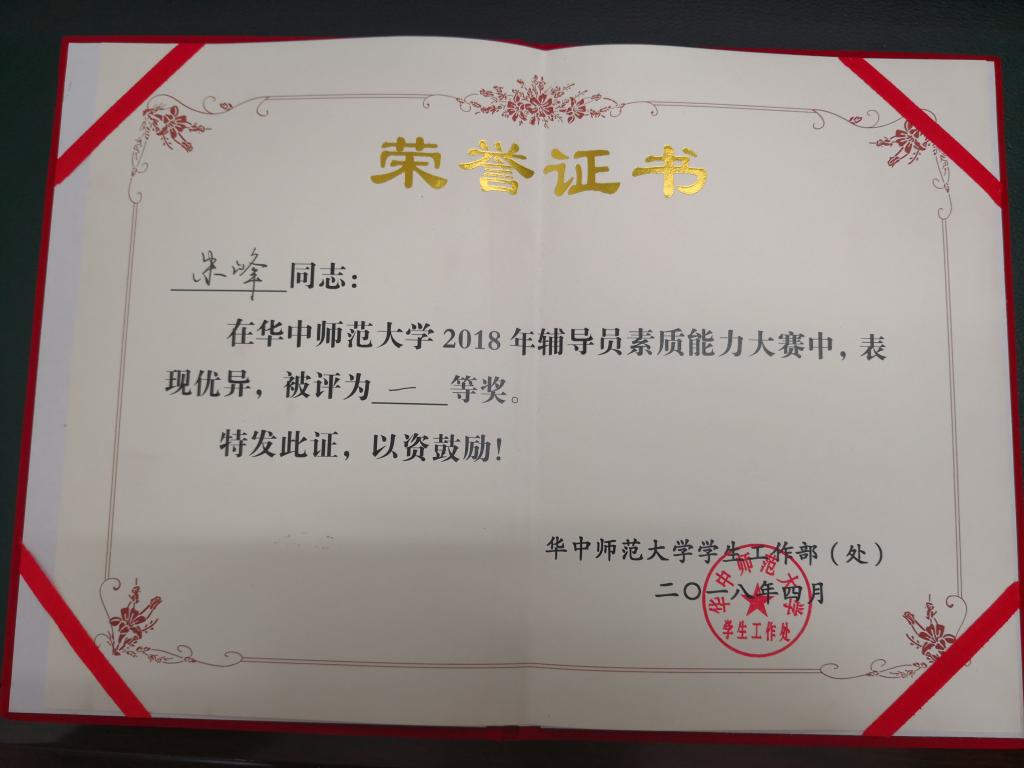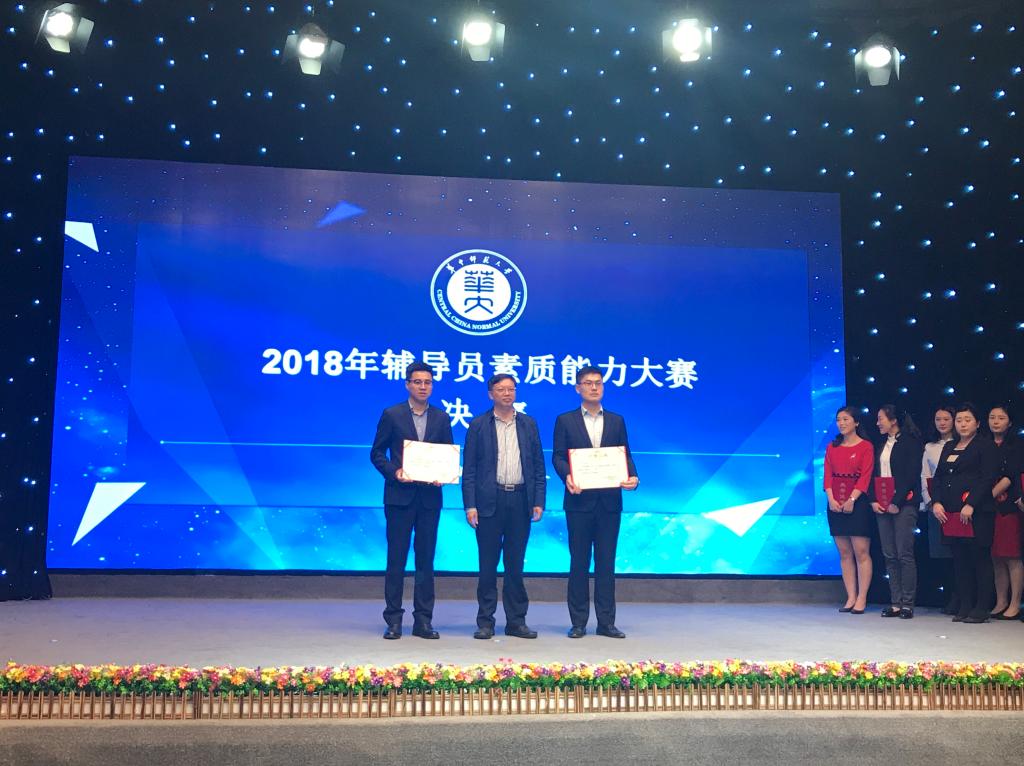 校党委副书记覃红和学校相关职能部门领导、学校政工干部出席。我院辅导员朱峰在决赛中脱颖而出,获评华中师范大学2018年辅导员素质能力大赛一等奖,将代表学校参加湖北省2018年辅导员素质能力大赛。