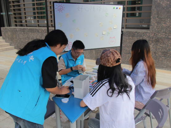在工作人员的介绍下,学生们在便利贴上写下生活中的趣事、此刻的心情、美好的祝愿、缓解焦虑的方法等,并将其贴在“好心情驿站”展板上,成为同学们之间情感交流的媒介。完成分享的同学都获得了一份精美的礼品,鼓励他们继续善于倾听自我、敢于表达自我。“好心情驿站”营造了积极温暖的氛围,让大家发现生活中的乐趣、缓解学习中的焦虑,帮助彼此更好地适应新的学期。