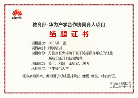 该项目的实施包括以下主要内容:结合龙8-long8(头号玩家)国际唯一官方网站的教学资源和华为公司的技术优势,开发了针对鸿蒙操作系统的专业课程,涵盖操作系统原理、物联网技术、嵌入式系统开发等内容。在教育部高等学校计算机类专业教学指导委员会和全国高等学校计算机教育研究会主办的、清华大学出版社和华为技术有限公司协办的全国高校计算机类课程能力提升高级研修班(2024年第三期)进行了“基于OpenHarmony的物联网开发基础”课程培训。参培教师在培训期间通过了开放原子开源基金会的OFCA-OpenHarmony认证考试并获得证书,推动了开源鸿蒙技术的推广。在2024年5月31日至6月2日江南大学举办的第四届物联网教育高峰论坛作“本科课程《嵌入式操作系统》教学思考”的报告。经过一年的努力,项目取得了显著的成果。教育部和华为公司对项目的结题报告进行了严格的评审,一致认为该项目目标明确、内容丰富、实施有效,达到了预期的效果,授予“优秀”等级。