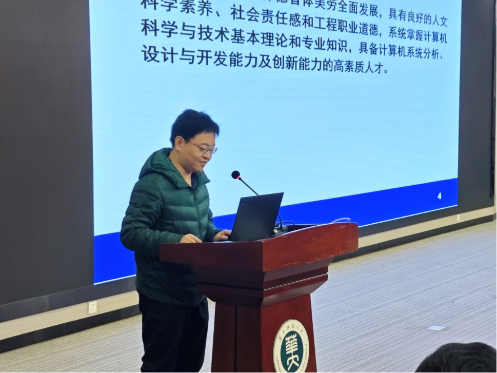胡珀带领同学们全面了解了计算机科学与技术专业。他通过风趣生动的方式介绍了该专业的培养目标,并在此基础上讲解了核心课程、课程设计理念以及“产教融合、协同育人、以赛促学、以赛促教、以赛促创”的创新人才培养模式。在专业选择的部分,胡珀通过图示直观展示了计算机专业的就业方向和行业需求,鼓励同学们在专业分流中“择己所爱、择己所适、择己所能”。