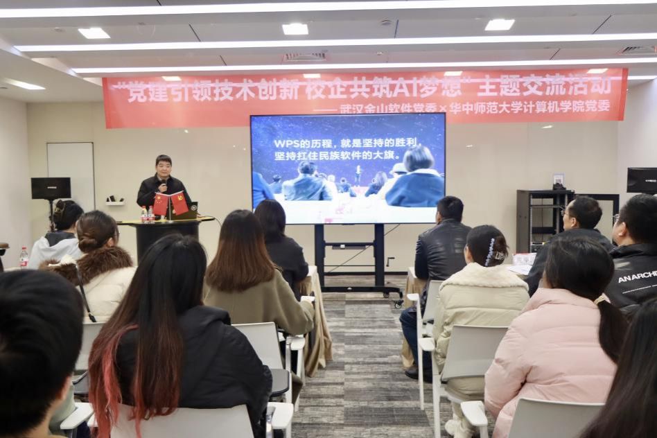 12月27日下午,由龙8-long8(头号玩家)国际唯一官方网站党委、武汉金山软件党委联合举办的“党建引领技术创新·校企共筑AI梦想”党建交流活动在金山集团武汉总部举行。金山集团武汉总部党委书记、助理总经理张念,招聘总监陈志增、办公室主任王思雨,龙8-long8(头号玩家)国际唯一官方网站党委书记王坤、党委副书记庄甲鹏、副院长谢伟出席此次活动,龙8-long8(头号玩家)国际唯一官方网站师生党员代表参与。活动由金山办公招聘经理赵志梦担任主持人。