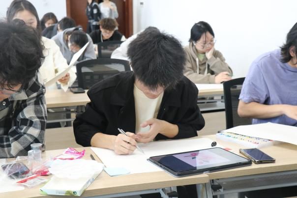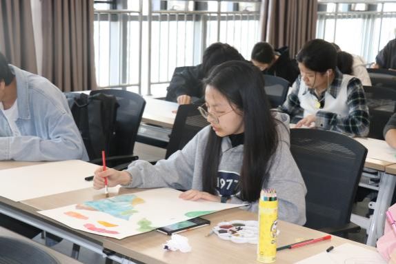 在自由创作环节,现场准备水彩、彩铅、蜡笔等多种绘画工具,供参与者进行主题创作。活动中,学生们或低头沉思,或与身旁伙伴轻声探讨绘画思路和技巧,现场洋溢着浓厚的创作氛围。在春日主题的激发下,同学们以画笔为媒,将内心世界具象化为一幅幅春日图景。