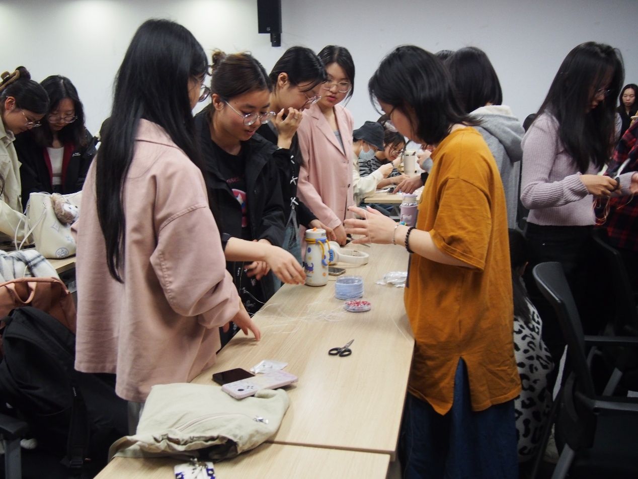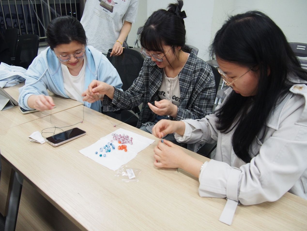 现场准备了品类多样的制作材料,包括多种颜色、材质的串珠和装饰配件,以及不同款式的编织细绳。同学们根据个人喜好挑选珠子,将不同形状与色彩的珠子精心搭配,再通过细绳串联成型。每条手链都呈现出独特的风格,大家在动手过程中充分感受到手工制作的乐趣,也放松了心情。