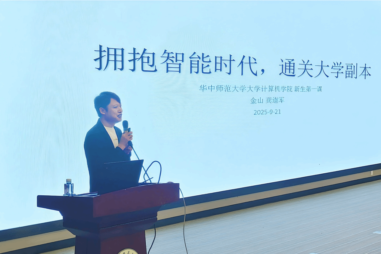 紧接着,开学第一课正式开讲。金山软件集团副总裁龚道军以“拥抱智能时代,通关大学副本”为题,结合自身二十余年的行业经验,围绕科技行业发展历程、当前技术发展趋势、成长路径规划和典型企业介绍等内容与新生进行交流。他深入探讨了智能技术在不同领域的应用,拓展了学生对技术发展的全面理解,引导新生深入感受技术对职业和时代发展的巨大影响力。同时,他借助反思的方法对大学生活规划进行剖析,帮助新生建立个人学习和认知方法,鼓励新生在大学期间主动探索了解自我,在实践中重塑认知。互动环节,他耐心解答了同学们在专业学习与技术发展方面的疑问。在热烈的现场交流中,开学第一课画上句号,也标志着学院新生正式开启大学学习生活新篇章。