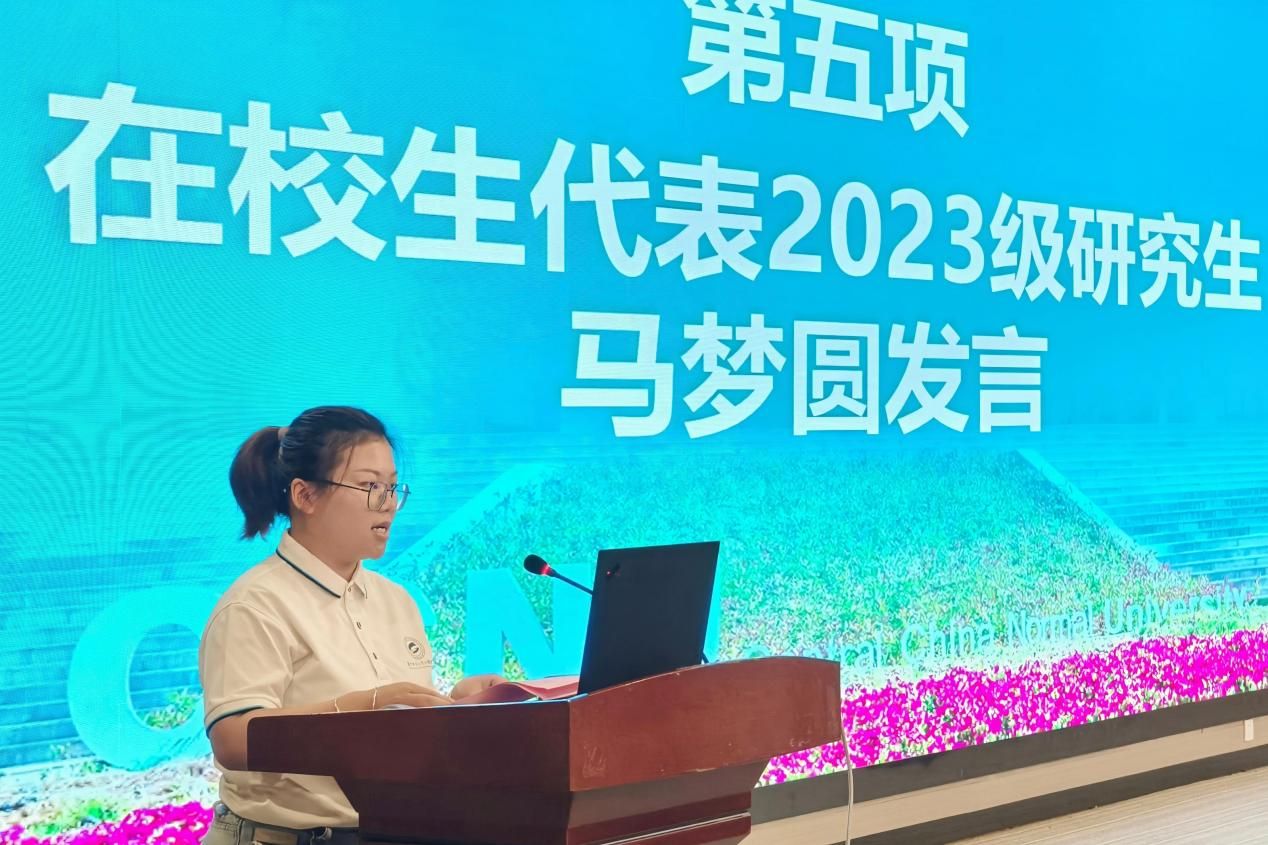 2025级本科生刘汉文作为新生代表,分享了选择计算机专业的初心和对大学生活的期待,立志践行“忠诚博雅、朴实刚毅”的华师精神。2023级研究生马梦圆作为在校生代表,结合自身经历,建议新生走出舒适区,追求全面发展,用代码书写理想。