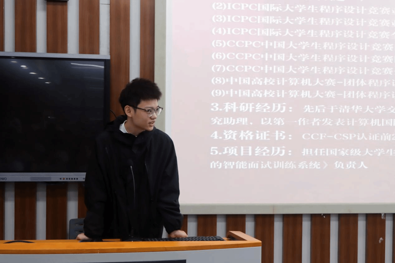 曾位俊以“博学励志”“笃行创新”“融智致远”为框架,分享了自己成功保研北大的经验。作为多项赛事获奖者及大创项目负责人,他指出,竞赛是保研的重要加分项,建议同学们大二开启科研训练、大三力争产出成果,还可以主动尝试担任科研助理以积累经验。针对“大一是否需具备计算机基础”的疑问,他则以自身“零基础起步”的经历为例,鼓励同学们勇于迈出第一步,在竞赛与科研中日积月累、突破自我。