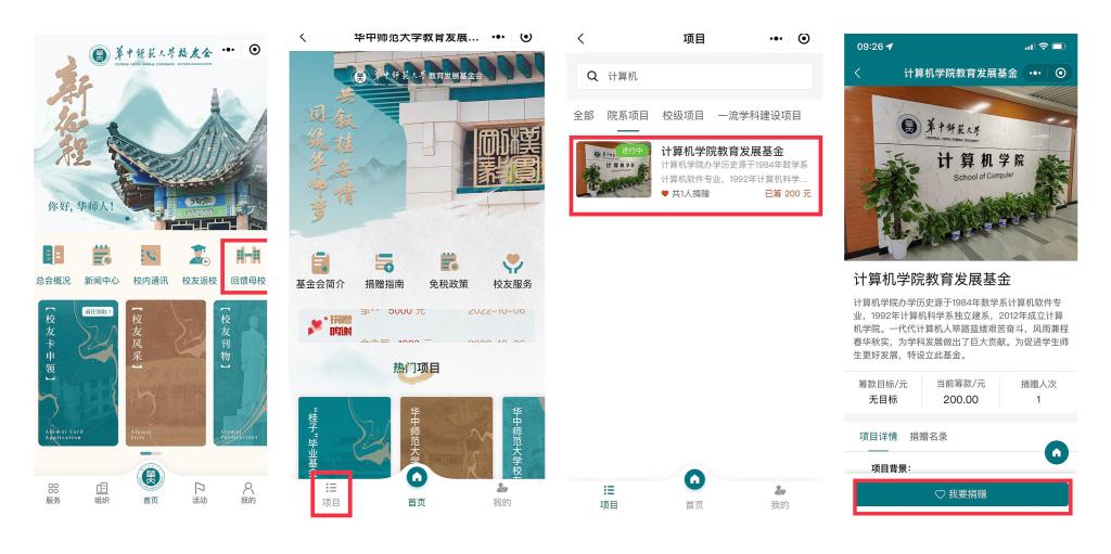 请有捐赠意向的校友点击下方小程序“华中师大校友”,点击“回馈母校”-“项目”,搜索“龙8-long8(头号玩家)国际唯一官方网站教育发展基金”直接进行捐赠。