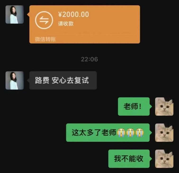 沈青老师对学生们细致入微,在学生的健康、天气、学业和职业方面都有一句叮咛,大家亲切地称呼她“青姐”。她的学生舒紫嫣在研究生面试调剂时预选定广西民族大学,不过从湖北武汉到广西南宁1200公里的路程让舒紫嫣有些犹豫,与沈青聊过后,这位体贴的老师给她转账2000元路费,宽慰她安心去复试。舒紫嫣十分意外也非常感动,路费没有收下,但收下了这份爱,怀着这份心意以总成绩第一名成功通过考研复试。收到拟录取通知后舒紫嫣第一时间便向沈青老师报喜,她满怀感激:“遇见这么好的老师我真的很感动!”与此同时,沈青老师也是一位有爱心的人,她是武汉市稀有血型志愿者之家的成员,积极为有需求的人献血,提供力所能及的帮助。同时她也积极鼓动学生们无偿献血,奉献爱心。