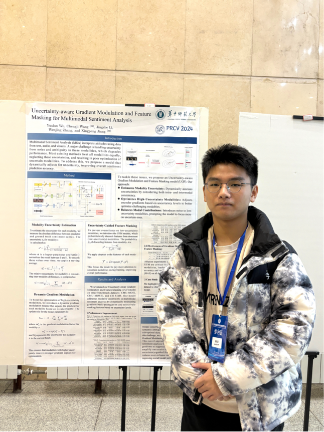 随着经验的累积,他从课题中的“追随者”逐渐成长为“领导者”。在蒋兴鹏老师的指导下,他开始尝试组建团队并主持“基于多模态情感分析的VR抑郁症在线干预平台”等项目。这些项目经历不仅让他在科研竞赛中崭露头角,也帮助他找到了个人发展的方向。此后,他跟随王成济老师,正式开启了学术科研的新征程。在王老师的悉心指导下,他顺利发表了人生的第一篇一作论文。三年间,他从懵懂青涩到游刃有余,深刻体会到知识不仅限于课本里,还存在于每一次探索和实践过程中。