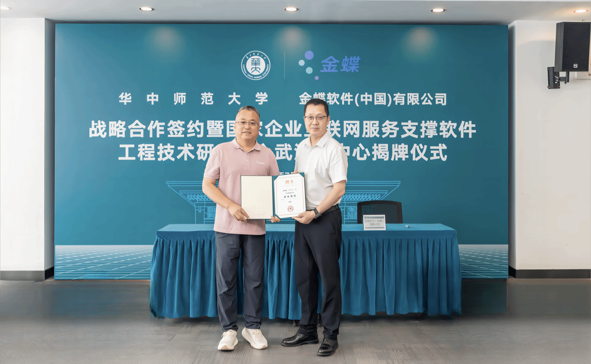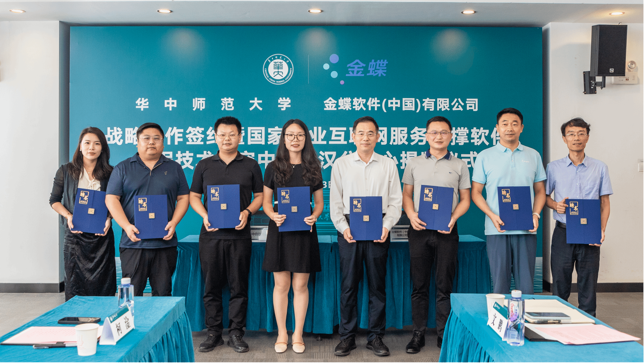 签约仪式上,王坤与陈慧蛟代表双方单位签署《金蝶软件(中国)有限公司与华中师范大学战略合作协议》。刘三女牙、林法成等双方领导共同见证签约。